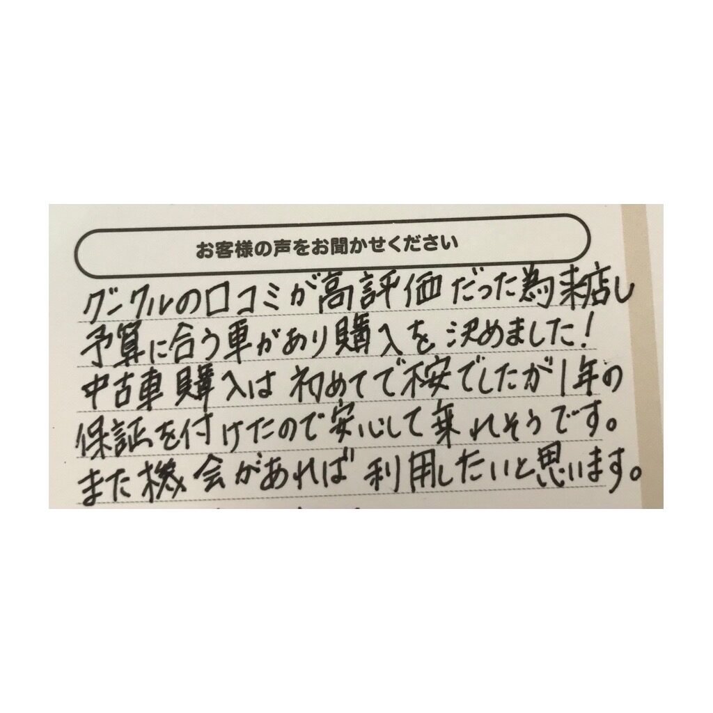 ・お客様の声 Googleの口コミが高評価だった為来店し予算に合う車があり購入を決めました!中古車購入は初めてでう不安でしたが1年の保証を付けたので安心して乗れそうです。また機会があれば利用したいと思います。 ・レビューありがとうございます。 郡山市でお客様に選ばれ続けるお店であるよう、信頼いただけるサービスを提供し続けてまいります。