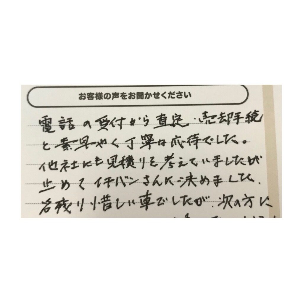 ・お客様の声 電話受付から査定・売却手続きと素早く丁寧な対応でした。他社にも見積もりを考えていましたがやめてイチバンさんに決めました。名残惜しい車でしたが、次の方に大事に乗ってもらえればと思っています。 ・レビューありがとうございます。 大事にされていたお車を青森市の当店にご売却いただき、誠にありがとうございました。今後も1台1台のお車に対して丁寧に接し、誠実に対応してまいります。