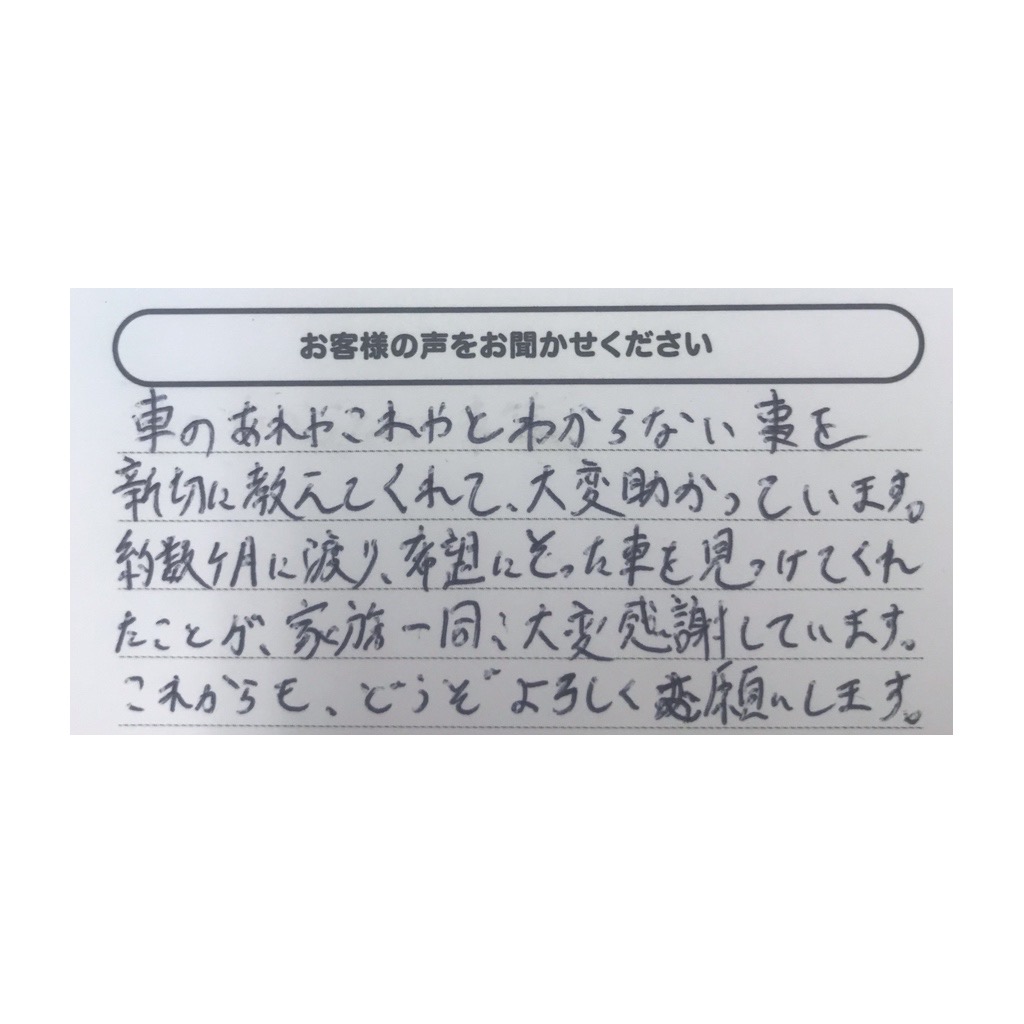 車のあれやこれやとわからない事を親切に教えてくれて大変助かっています。約数か月にわたり、希望にそった車を見つけてくれたことが家族一同大変感謝しています。これからもどうぞよろしくお願いします。