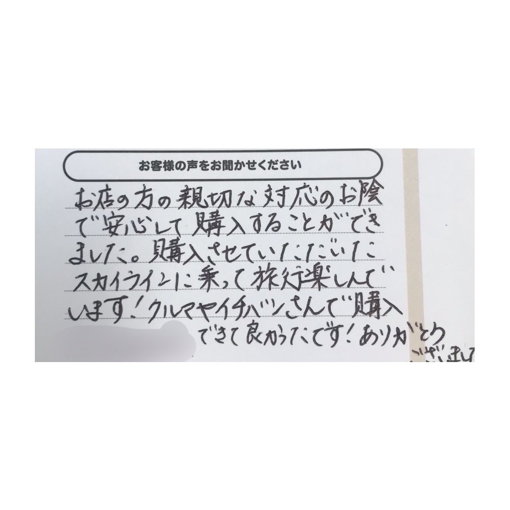 お店の方の親切な対応のお陰で安心して購入することができました。購入させていただいたスカイラインに乗って旅行楽しんでいます!クルマヤイチバンさんで購入できて良かったです!ありがとうございました^^