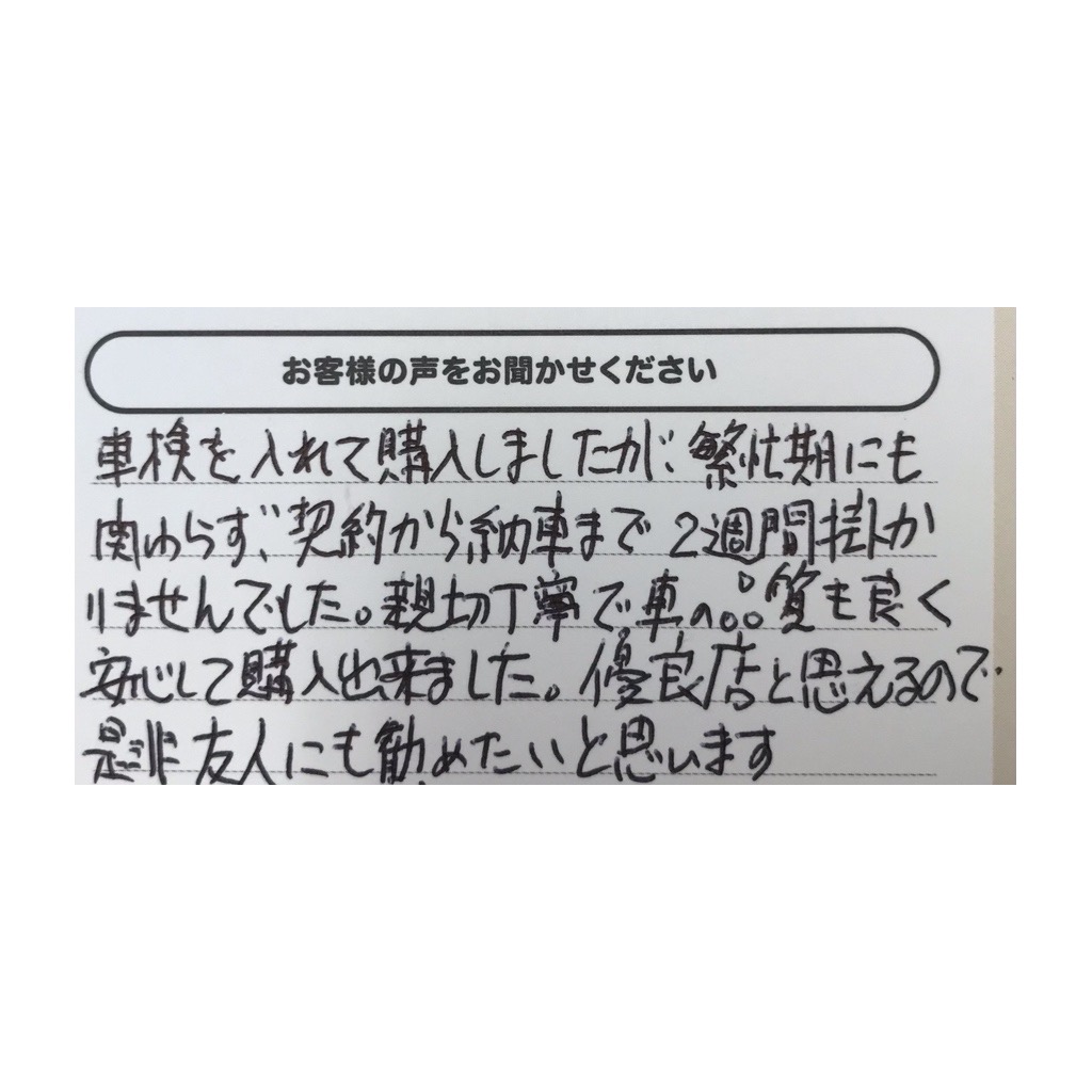 2026.01.26 郡山店 軽自動車 K様 ・お客様の声 車検を入れて購入しましたが、繁忙期にも関わらず、契約から納車まで2週間掛かりませんでした。親切丁寧で車の品質も良く安心して購入出来ました。優良店と思えるので是非友人にも勧めたいと思います。 ・レビューありがとうございます 当店では、柔軟かつ迅速な対応を心がけております。その甲斐あって「親切丁寧」とのお言葉を頂戴し、スタッフ一同嬉しく思っております。