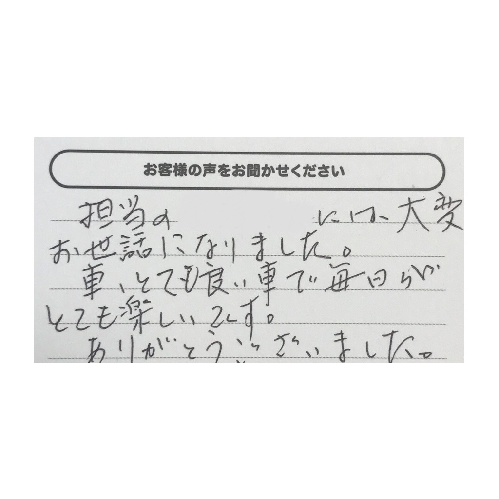 2025.09.10 八戸店 軽自動車 M様 ・お客様の声 担当者には大変お世話になりました。車、とても良い車で毎日がとても楽しいです。ありがとうございました。 ・レビューありがとうございます。 八戸市にて、お客様一人ひとりのご状況に合わせた最適なご提案ができるよう、八戸店スタッフ一同努めてまいります。